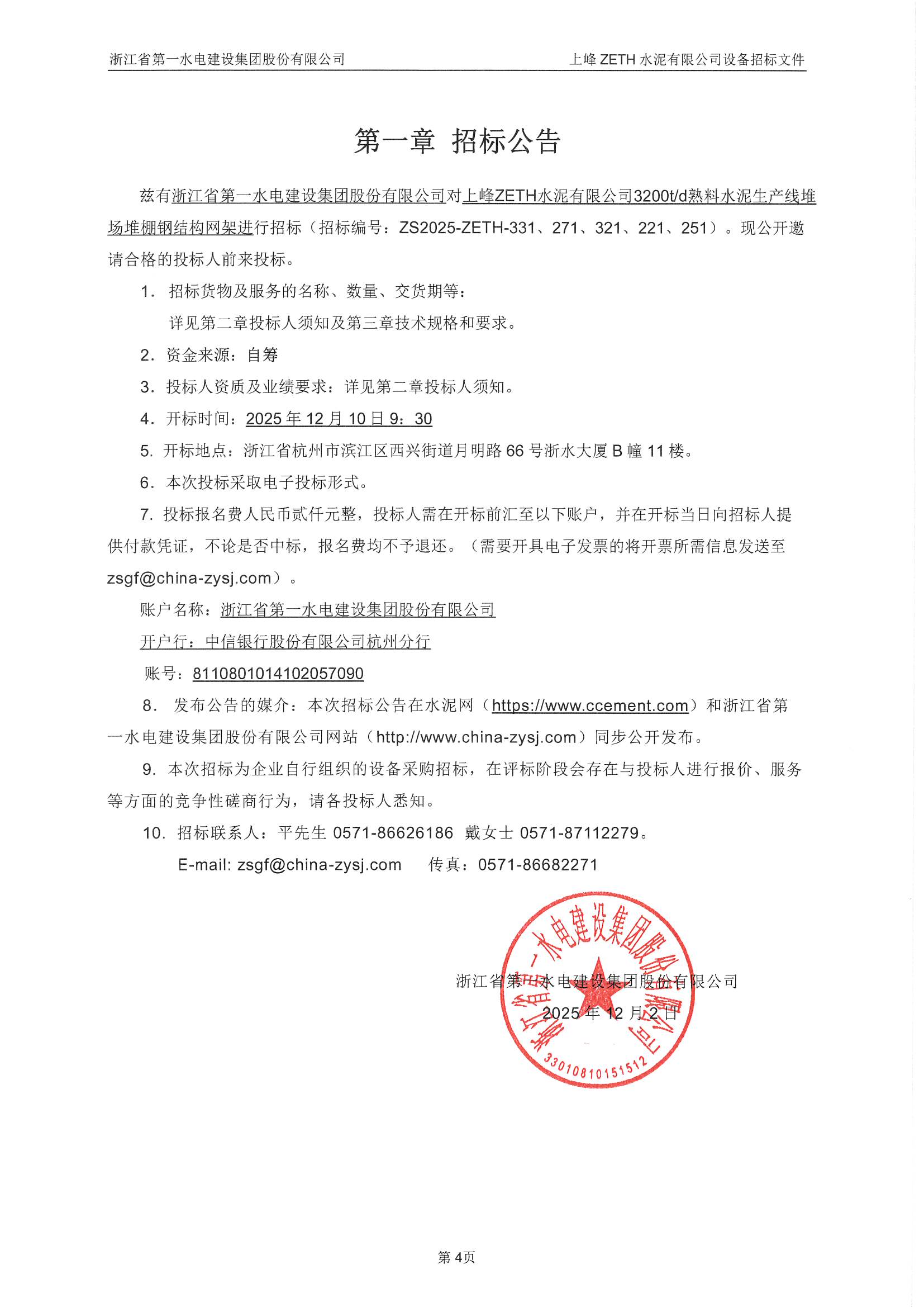 上峰ZETH水泥有限公司3200t/d熟料水泥生產線堆場堆棚鋼結構網架招標公告